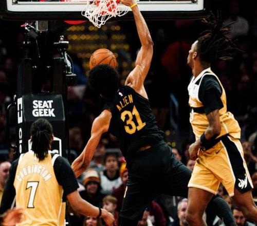 这场对阵奇才的比赛,从开局就展现了骑士的统治力。首节哈登与米切尔各砍9分,两人一攻一传配合默契,哈登频频造犯规罚球线得分,米切尔则用犀利突破终结。骑士迅速拉开到16分领先。次节,梅里尔突然爆发,他单节6投6中,三分球4中4,狂砍17分,成为球队第二节的奇兵。内线阿伦也全面开花,篮下翻江倒海,多次完成强硬终结。即便奇才在第二节发起反扑,骑士依然稳住阵脚,为下半场的一波流奠定基础。上半场结束时,梅里尔已经命中7记三分,命中率100%,手感火热到仿佛巅峰期的克莱汤普森附体。下半场骑士彻底不给对手机会,分差很快来到20分以上,比赛早早失去悬念。
