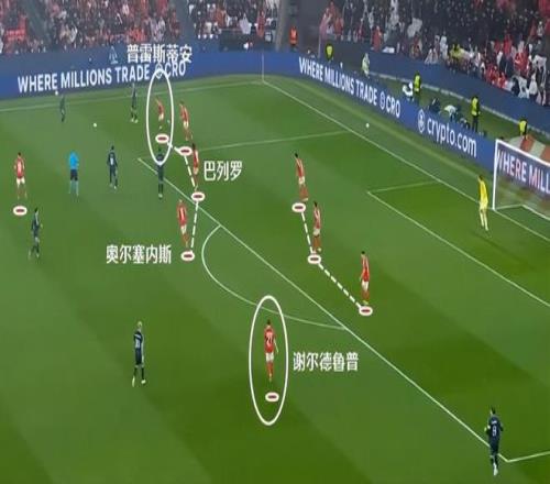 这一波的防守,最初就是边锋普雷斯蒂安尼退防到边后卫身侧限制拿球的卡雷拉斯。皇马这边回传后,本菲卡又让后腰巴列罗卡在肋部,让皇马很难对禁区内发起进攻。