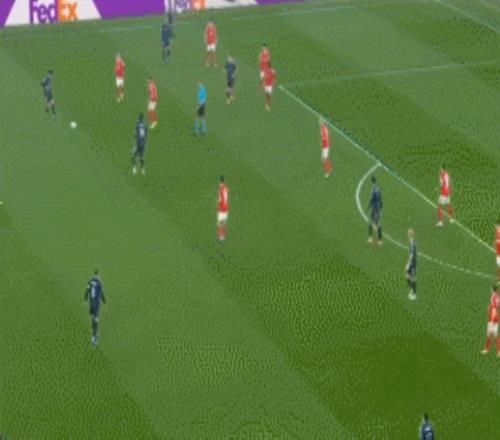 姆巴佩就是在面对对手偏弱的边后卫时,利用自己的速度和爆发力突然启动,甩开防守人头球破门。这样的打击方式原本是皇马最擅长的手段之一,只是姆巴佩一般情况下并不怎么喜欢接应传中球。如果他愿意多尝试,会是打击本菲卡的有效手段之一。